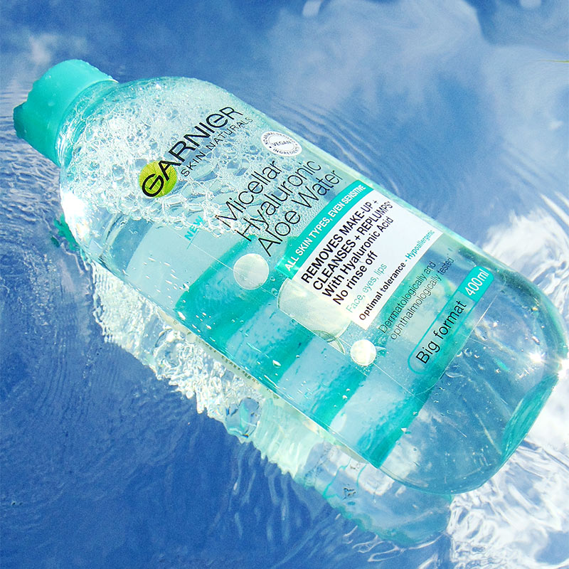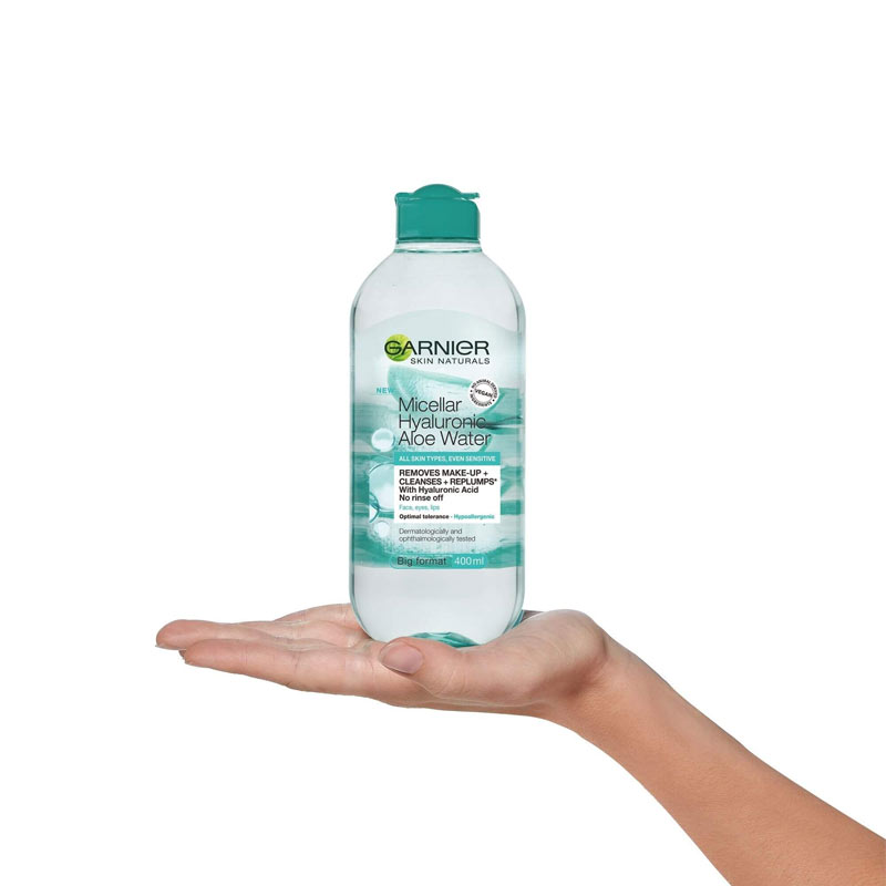 میسلارواتر آرایش پاک کن گارنیه حاوی آلوئه ورا و هیالورونیک اسید حجم 400 میلی لیتر، ساخت فرانسه و یک محصول عالی جهت پاک نمودن روزانه پوست است. این میسلارواتر تمامی آلودگی ها، ناخالصی ها و مواد آرایشی پوست را تمیز کرده و منافذ آن را پاکسازی می کند. محلول پاک کننده آرایش گارنیر حاوی عصاره آلوئه ورا و هیالورونیک اسید برای پوست صورت، چشم ها و لب ها قابل استفاده است. این میسلارواتر پوست را آبرسانی کرده و آن را نرم و مرطوب می کند. میسلار واتر Garnier حاوی هیالورونیک اسید و آلوئه ورا توسط متخصصان پوست و چشم تایید شده است. این میسلارواتر کاملا ضد حساسیت بوده و برای انواع پوست مناسب می باشد. این محصول سبب تسکین و شفافیت و طراوت بخشی پوست می شود.
